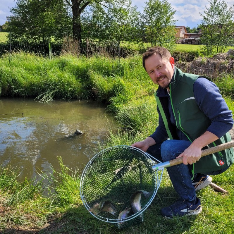 Wo schon der Opa mit der Schaufel den Teich ausgegraben hat, setzt Daniel Spießl die Tradition begeistert fort. In mehreren Naturteichanlagen züchtet er Forellen und Karpfen. Zander, Saibling und Schleien ergänzen sein Programm.