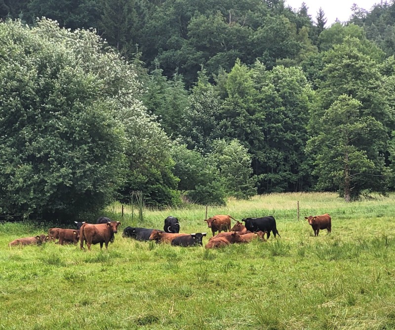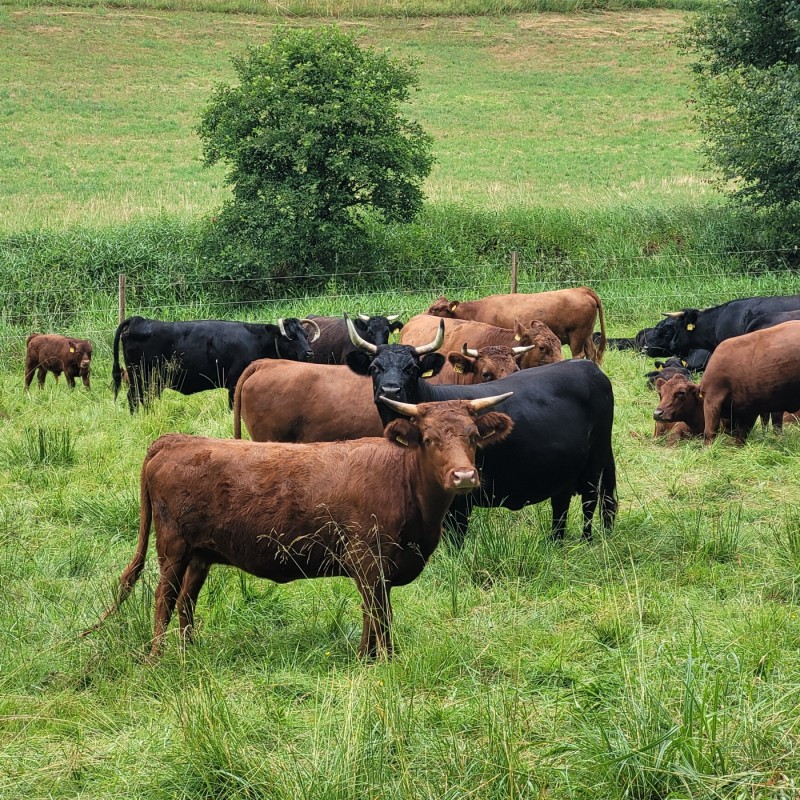 Im bachdurchflossenen Tälchen mit selten gewordenen agroforstartigen Strukturen führt die 19jährige Matronin die Mutterkuhherde mit Zuchtbullen. Die kleinen und robusten Dexterrinder entwickeln ein besonders charaktervolles Fleisch, wachsen aber nur langsam. Ines und Matthias lassen sie daher erst im Alter von mindestens zweieinhalb Jahren schlachten.